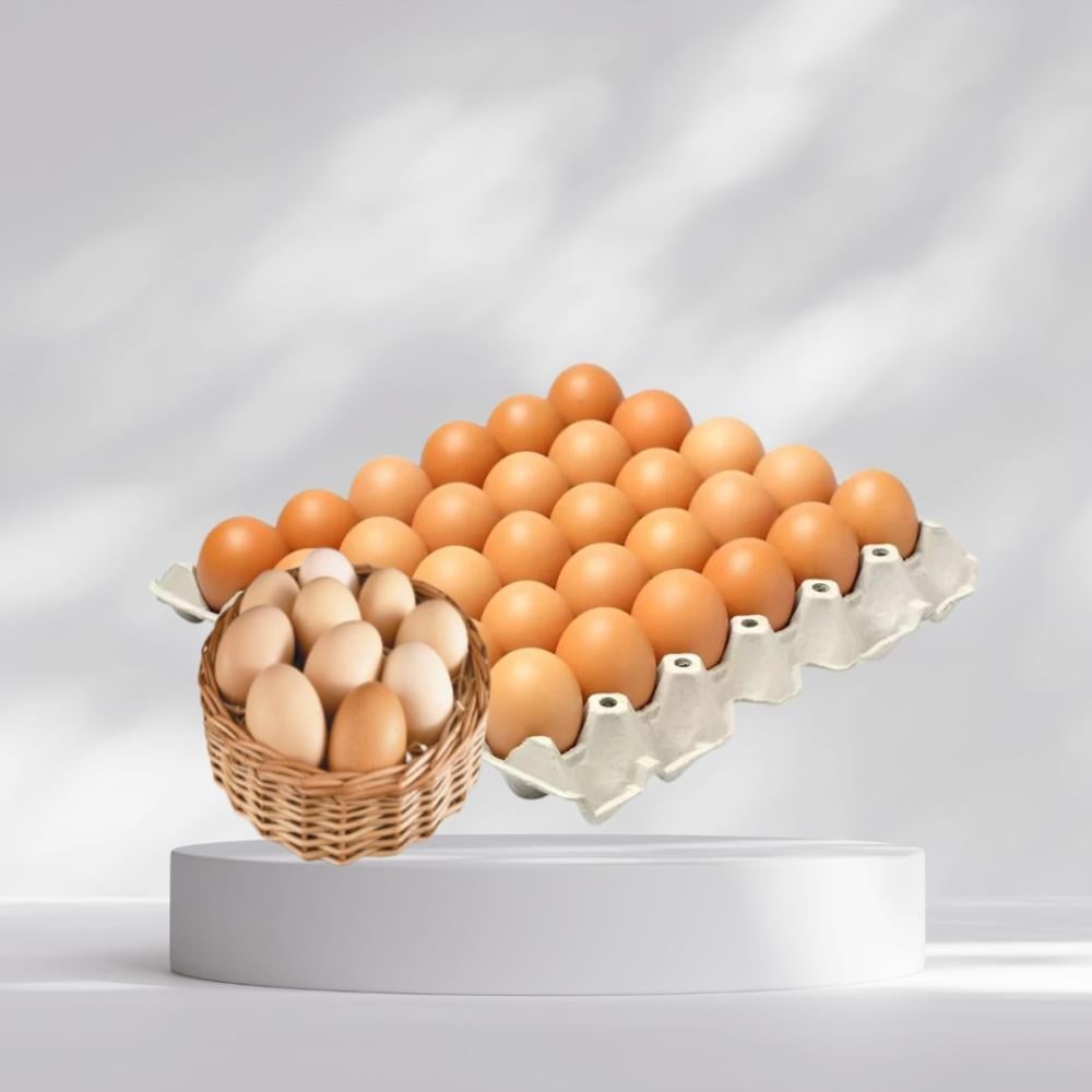 "بيض طازج من دجاج مراعي حر، يتغذى على الحبوب الطبيعية. يُجمع يوميًا ويُعبأ بعناية للحفاظ على نضارته."